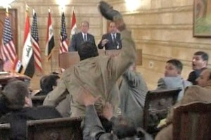 Ein irakischer Journalist wirft während einer Pressekonferenz in Bagdad mit seinen Schuhen nach George W. Bush (Foto) – und sein deutscher Kollege Carsten Kühntopp macht daraufhin aus seinem Herzen keine Mördergrube: