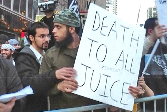Das Foto entstammt einer Pro-Hamas-Demonstration in Manhattan am 28. Dezember 2008. In Ramallah wurden am gleichen Tag Einheimische beim Konsumieren zionistischer Fruchtsäfte gesehen. Die Parole scheint also nicht bei allen Palästinensern konsensfähig zu sein.