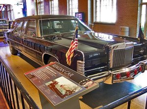 Ronald Reagans Dienstwagen, ausgestellt im Henry-Ford-Museum im Detroiter Vorort Dearborn. Gemeinsam mit der sagenhaften Greenfield Village – die man wahlweise zu Fuß oder mit Nachbauten des Modells Ford T durchqueren kann – bildet der riesige Ausstellungskomplex das größte Indoor-Outdoor-Museum der USA. Dass Henry Ford nicht nur ein erfolgreicher Unternehmer war, sondern auch ein glühender Antisemit, der aus Überzeugung mit den Nationalsozialisten kooperierte, wird allerdings rundweg unterschlagen.