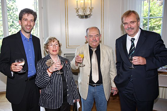 Foto: Tübingens Oberbürgermeister Boris Palmer, Felicia Langer mit ihrem Ehemann, Staatssekretär Hubert Wicker (von links) beim Empfang in der Stuttgarter Villa Reitzenstein (Quelle: Staatsministerium)