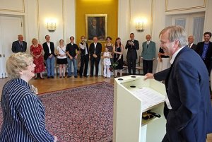 Foto: Staatssekretär Hubert Wicker hält die Laudatio auf Felicia Langer. Villa Reitzenstein, Stuttgart, 16. Juli 2009 (Quelle: Staatsministerium).