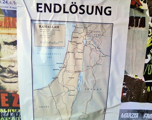 Man kann über Lorenz Jäger vieles sagen, aber ganz gewiss nicht, dass er nicht jederzeit für eine rabulistische Performance gut ist. In seinem Stammblatt, das sich völlig zu Recht Zeitung für Deutschland nennt, hat sich der Diplom-Soziologe just gestern mit einem Kommentar zum neuesten Werk des dänischen Künstlerduos Surrend verewigt. Dieses Werk (Foto oben) – das in verschiedenen Berliner Stadtteilen verklebt wurde – ist ein Plakat, das balkendick mit der Überschrift „Endlösung“ aufmacht und darunter einen Landkartenausschnitt zeigt, auf dem Israel nicht mehr existiert, sondern einem Staat namens „Ramallah“ gewichen ist. Jäger sieht darin eine „Satire gegen Israelkritiker“ und glaubt: „Wer die Aktionen von ‚Surrend’ kennt, müsste wissen, was diesmal die Absicht war. Nämlich: nicht irgendeine Attacke auf das Existenzrecht Israels.“ Ganz im Gegenteil solle „offenbar der Kritik an bestimmten Formen der israelischen Politik durch Konsequenzmacherei der Boden entzogen werden, durch den Gestus: Schaut her, dahin wird es kommen“. Durch das Wort „Endlösung“ werde dabei „infamerweise suggeriert, dass eben hierin die wahre, aber verschwiegene Absicht der Israel-Kritiker liege“.
