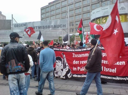 Das Foto entstand auf einer antiisraelischen Demonstration am 1. Juni 2010 in Berlin, an der Linke, Islamisten und „Graue Wölfe“ teilnahmen. Die Frau auf dem Transparent ist Leila Khaled, die erste Flugzeugentführerin der Weltgeschichte und damit sozusagen die Urmutter der humanitären Pazifisten von der Mavi Marmara. (© verbrochenes.net)