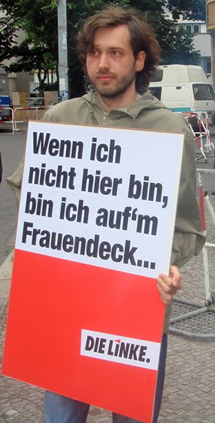 Das Foto (© Dissi) entstand während der Kundgebung „Gegen das Bündnis der Kriegstreiber von Linkspartei und Hamas! Solidarität mit Israel!“ am 12. Juni 2010 in Berlin vor der Zentrale der Linkspartei, dem Karl-Liebknecht-Haus. Das Plakat ist an einen Titel von Peter Licht angelehnt und spielt auf die Geschlechtersegregation auf der Mavi Marmara an, der sich die beiden Bundestagsabgeordneten der Linkspartei widerspruchslos unterwarfen.