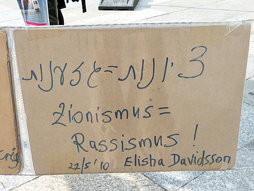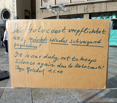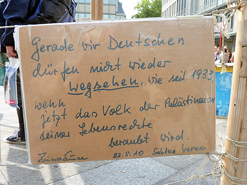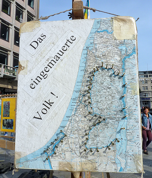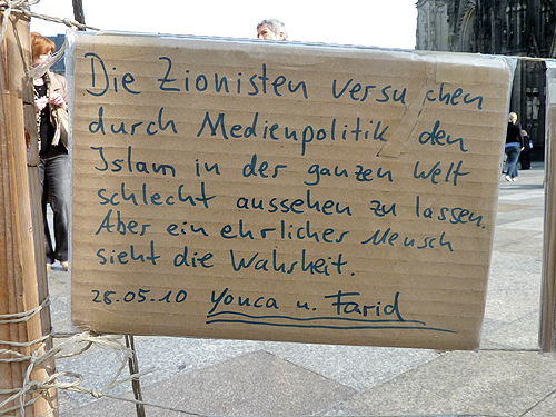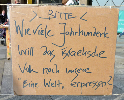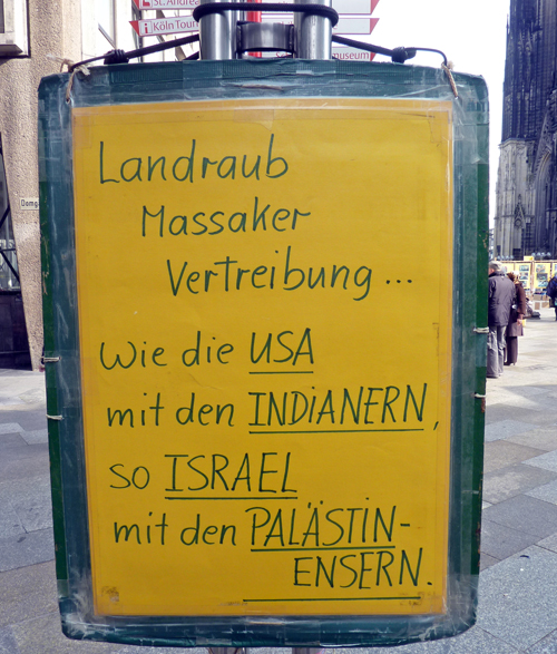 Für ein paar Monate hatte Walter Herrmann, als ihm justizielles Ungemach drohte, die antiisraelischen Exponate seiner notorischen Kölner „Klagemauer“ abgehängt und sich mit der Ausstellung vorübergehend von der Domplatte entfernt. Inzwischen ist jedoch alles wieder beim Alten, wie Henryk M. Broder bei einer Stippvisite festgestellt und fotografisch dokumentiert hat.