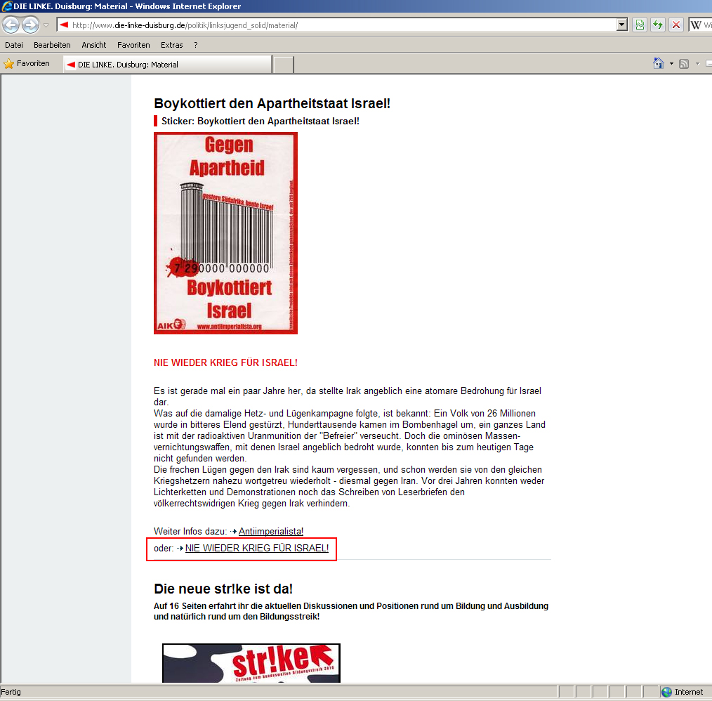 Wie lange die antisemitische Hetzschrift schon auf der Internetseite des Duisburger Kreisverbands der Linkspartei zu lesen war, ließ sich bislang nicht eruieren.* Zu einiger Bekanntheit gelangte sie jedenfalls erst am heutigen Morgen, nachdem der entsprechende Link in Windeseile über die Netzwerke Twitter und Facebook verbreitet und von diversen Blogs und Websites aufgegriffen worden war. Seit dem frühen Nachmittag ist das Pamphlet nicht mehr auf der Homepage der Linkspartei zu finden, und auch der Aufruf „Boykottiert den Apartheitstaat [sic!] Israel!“ wurde offline genommen.** Dass diese Maßnahme ein Ausdruck von Einsicht ist, darf gleichwohl bezweifelt werden; vielmehr muss man davon ausgehen, dass die Genossen lediglich einmal mehr versucht haben, ihre Spuren zu tilgen. Ein Versuch, der zum Scheitern verurteilt ist – aus technischen wie aus politischen Gründen.