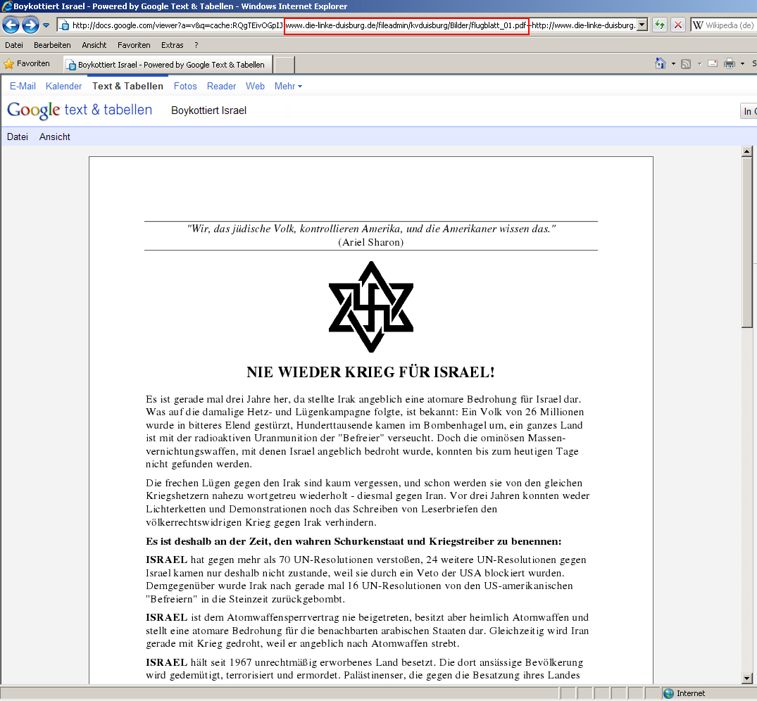 Denn auf dessen Homepage – genauer gesagt: auf der dazu gehörigen Unterseite des Jugendverbandes Solid – fand sich bis vor wenigen Stunden ein Aufruf mit dem Titel „Boykottiert den Apartheitstaat [sic!] Israel!“, ergänzt um einen Link zu einem rund fünf Jahre alten Flugblatt, das ebenfalls auf dem Server der Duisburger Linkspartei beherbergt wurde. Dieses Pamphlet war mit der Überschrift „Nie wieder Krieg für Israel!“ versehen worden – und damit es auch der Letzte auf den ersten Blick begreift, hatte man der Headline zum einen ein Symbol, das eine Mischung aus einem Davidstern und einem Hakenkreuz darstellt, und zum anderen ein angebliches Zitat des früheren israelischen Premierministers Ariel Sharon vorangestellt: „Wir, das jüdische Volk, kontrollieren Amerika, und die Amerikaner wissen das.“