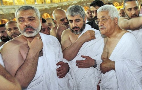 Zum Foto: Die Hamas-Führer Ismail Haniya und Khaled Meshaal sowie der palästinensische Präsident Mahmud Abbas (v.l.n.r.) beim gemeinsamen Besuch der Großmoschee in Mekka. Das Bild entstand im Februar 2007, als die Hamas und die Fatah den – damals gescheiterten – Versuch unternahmen, eine Einheitsregierung zu bilden.