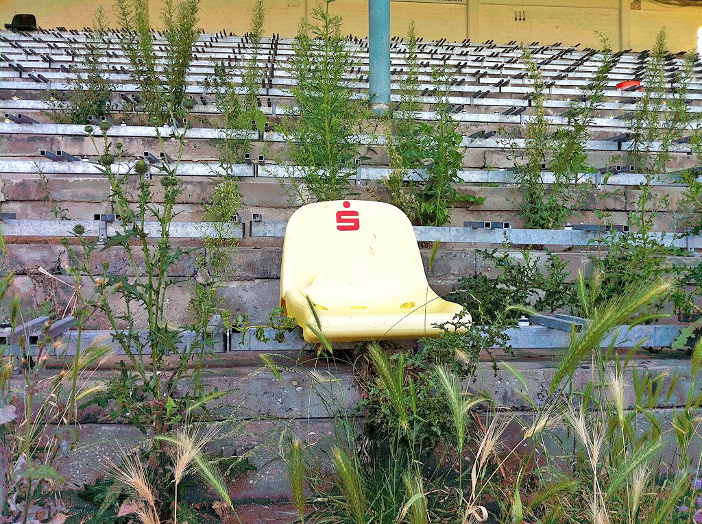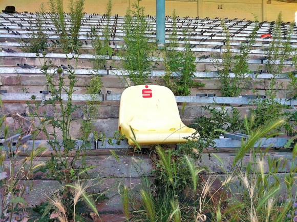 Ein Platz im Grünen: Der letzte Hartschalensitz auf der alten Haupttribüne hat es sich gemütlich gemacht. Kaum zu glauben, dass er (vermutlich) mal Teil eines „M“ in „ALEMANNIA“ war.