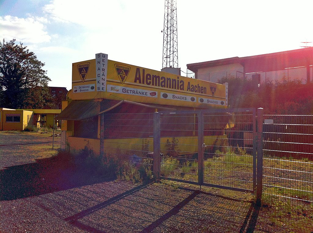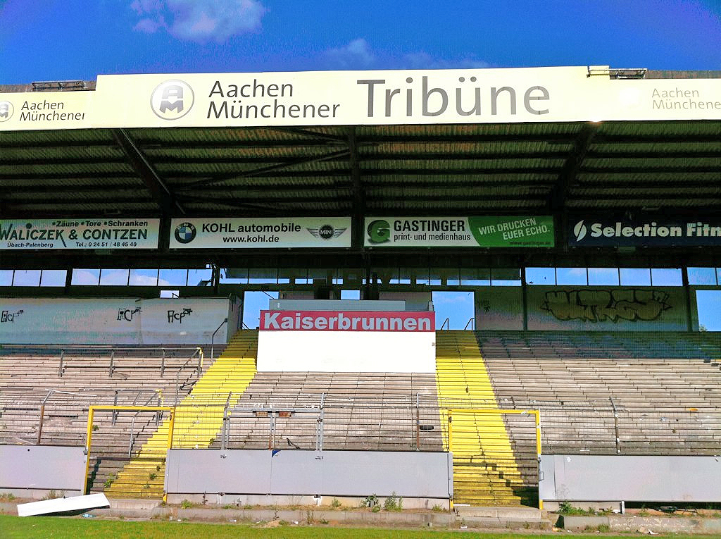 Am 3. Juni 1928 wurde er mit einem Spiel der Alemannia gegen Preußen Krefeld eingeweiht (der Endstand lautete übrigens 4:3); heute ist er dem Verfall preisgegeben, und in Kürze wird die Abrissbirne anrücken. Auf dem Gelände des legendären alten Tivoli in Aachen werden dann Einfamilienhäuser, ein Verbrauchermarkt und Büroflächen entstehen. Bereits seit zwei Jahren trägt die Alemannia ihre Heimspiele im unmittelbar neben dem alten Stadion gelegenen neuen Tivoli aus, und auch wenn diese Stätte zweifellos alle Anforderungen an eine moderne Arena erfüllt – und, nebenbei bemerkt, erheblich mehr Charakter hat als viele andere Exemplare der neuen Generation von Stadien –, gibt es doch eine Menge bester Gründe, mit Wehmut an das langjährige Domizil der Schwarz-Gelben und seine unvergleichliche Atmosphäre zurückzudenken. Bald wird nur noch die Bushaltestelle vor dem (ehemaligen) Eingang zur überdachten Stehtribüne an den alten Tivoli erinnern, der gerade einen langsamen Tod stirbt, wie Rolf Behrens’ Fotostrecke eindrucksvoll zeigt. (Für eine – sehr lohnenswerte – größere Darstellung bitte auf das jeweilige Bild klicken.)