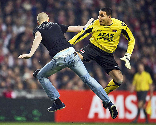 Es waren heftige Szenen, die sich am Mittwochabend beim Pokalspiel zwischen den beiden niederländischen Erstligisten Ajax Amsterdam und AZ Alkmaar zutrugen: 36 Minuten waren gespielt, als ein offenbar nahkampferprobter (zumindest aber -bereiter) Zuschauer auf den Platz lief und Alkmaars Torwart Esteban Alvarado im Sprung attackierte. Der Keeper der Gäste hatte den kahlrasierten Mann allerdings in letzter Sekunde bemerkt und schaffte es, dessen Angriff – ebenfalls im Sprung – abzuwehren (Foto oben). Der Angreifer ging daraufhin zu Boden und kassierte dort zwei weitere Fußtritte von Alvarado, bevor er von mehreren Platzordnern dingfest gemacht wurde. Schiedsrichter Bas Nijhuis stellte den Alkmaarer Torhüter mit der Roten Karte vom Platz, was geharnischte Proteste durch die Gastmannschaft zur Folge hatte und deren Trainer Gertjan Verbeek veranlasste, sein Team vom Feld zu holen und in die Kabine zu schicken. Die Partie wurde vom Referee schließlich notgedrungen abgebrochen.