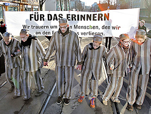 Die Häftlingsuniformen reichten nicht, auch die Gesichter hatten sie sich grau angemalt, um die Wohlstandsrosigkeit zu kaschieren: Eine Gruppe von Demonstranten, die gegen den Nazi-Aufmarsch in Magdeburg am 14. Januar protestieren wollten, hatte sich da etwas ganz Besonderes ausgedacht. Allerdings waren sie nicht barfuß unterwegs oder in Holzschuhen; so sieht man auf dem Foto oben die Markenschuhe, die Authentizität hat schließlich ihre Wettergrenzen. Wer nun vermutet, dass es sich hier um besonders radikale Gegner handelte, die zu jeder Form der Verhinderung eines Aufmarsches der Nazis bereit gewesen wären, hat weit gefehlt. Nicht nur, dass man sich schlicht auf die Straße legte, um sich wegtragen zu lassen. Um den Anschein allzu großer Identifikation mit den Opfern des Nationalsozialismus gar nicht erst aufkommen zu lassen, legten diese Leute eine Erklärung in Form eines Transparents vor, auf dem stand: »FÜR DAS ERINNERN – Wir trauern um jeden Menschen, den wir an den Faschismus verlieren«.