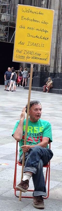 Seit etlichen Jahren schon ist sie zu sehen, mitten in Köln, im Schatten des Doms: jene »antisemitisch-antizionistische Installation, mit der Israel als blutsaugendes und mordendes Monster dämonisiert wird«, wie Henryk M. Broder es treffend formuliert hat. »Kölner Klagemauer« nennt sie Walter Herrmann (Foto), ihr Betreiber. Fast jeden Morgen baut er sie auf und abends wieder ab. Nach einigem juristischen Hin und Her genehmigte die Stadt Köln die aus Papptafeln bestehende Ausstellung als Dauerdemonstration und die auf den Tafeln niedergeschriebenen Kommentare – darunter solche wie »Hitler ist Vergangenheit, aber Israel ist Gegenwart!«, »Wie viele Jahrhunderte will das israelische Volk noch unsere ›Eine Welt‹ erpressen?« und »Gaza – das ›Warschauer Ghetto‹ der Palästinenser« – als Redebeiträge. Das Bundesverwaltungsgericht bestätigte im Jahr 2007 diese Rechtsauffassung. Um dem Versammlungsrecht zu entsprechen, müssen immer mindestens zwei Personen an der »Klagemauer« zu finden sein. Kein Problem für Herrmann: Gleichgesinnte Mitstreiter hat er genügend. Ein Antisemit kommt ohnhein selten allein.