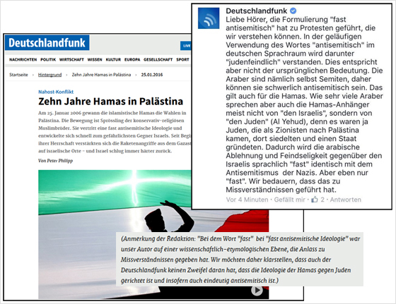 Dennoch wäre Philipps Hamas-Porträt nur ein beliebiger weiterer Beitrag zum Elend der deutschen Nahostberichterstattung gewesen, hätte der Deutschlandfunk nicht auf seiner Facebook-Seite nachgelegt und damit alles noch viel schlimmer gemacht. »Liebe Hörer, die Formulierung ›fast antisemitisch‹ hat zu Protesten geführt, die wir verstehen können«, heißt es dort. In der »geläufigen Verwendung des Wortes ›antisemitisch‹ im deutschen Sprachraum« werde darunter »judenfeindlich« verstanden. Das entspreche jedoch nicht der »ursprünglichen Bedeutung« des Wortes: »Die Araber sind nämlich selbst Semiten, daher können sie schwerlich antisemitisch sein. Das gilt auch für die Hamas. Wie sehr viele Araber sprechen aber auch die Hamas-Anhänger meist nicht von ›den Israelis‹, sondern von ›den Juden‹ (Al Yehud), denn es waren ja Juden, die als Zionisten nach Palästina kamen, dort siedelten und einen Staat gründeten. Dadurch wird die arabische Ablehnung und Feindseligkeit gegenüber den Israelis sprachlich ›fast‹ identisch mit dem Antisemitismus der Nazis. Aber eben nur ›fast‹.«